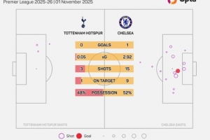體育資訊11月2日訊 英超第10輪比賽,熱刺在主場(chǎng)以0-1的比分不敵切爾西。本場(chǎng)比賽,熱刺的預(yù)期進(jìn)球數(shù)僅為0.05。