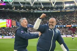 下半場補(bǔ)時(shí)第5分鐘,紹切克補(bǔ)射破門幫助西漢姆鎖定勝局,主帥努諾在場邊與教練組激動相擁。