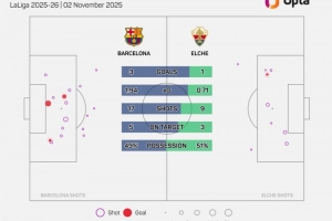 據OptaJose的數據統(tǒng)計,埃爾切是自2005-06賽季以來,首支在西甲聯(lián)賽中對陣巴薩時,控球率高于對手的升班馬球隊。