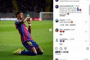 拉什福德社媒曬照慶祝勝利,配文:“主場(chǎng)勝利,氣氛絕佳。感謝大家的支持,蒂埃雷,正如我所承諾,這粒進(jìn)球獻(xiàn)給你。”