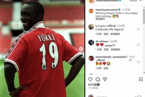 曼聯(lián)官方社媒曬出約克身穿本隊(duì)球衣的照片,配文:“祝德懷特-約克54歲生日快樂。”