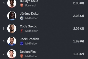 本賽季英超預(yù)期助攻排名(括號內(nèi)為實際助攻):