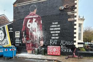 網(wǎng)上最新流傳的圖片顯示,阿諾德的壁畫被潑上了白色的油漆,一旁還寫著幾個(gè)大字“老鼠”、“再見了,老鼠”。其中“老鼠”一詞還用了西英雙語。