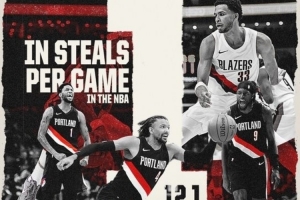 體育資訊11月5日訊 開(kāi)拓者官方發(fā)布數(shù)據(jù)海報(bào),球隊(duì)場(chǎng)均送出12.1次搶斷,排名聯(lián)盟第一。