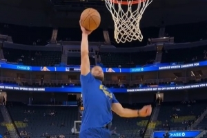 賽前,勇士球星庫里進(jìn)行熱身,自拋?zhàn)钥弁瓿蓡问挚刍@。