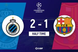 上半場傷停補(bǔ)時(shí)2分鐘,半場結(jié)束,巴薩暫1-2布魯日。