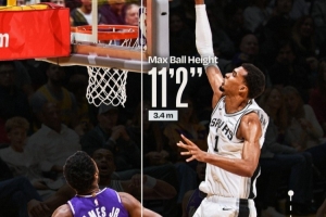 不過在比賽中,他仍有十佳球表現(xiàn)。NBA官方發(fā)布了他隔扣布朗尼一球的兩項數(shù)據,其中球的最高點達到了3.4米,而文班亞馬這一扣的滑行距離達到2.2米。