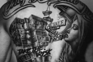 萊奧紋身的右側(cè)是圣母瑪利亞的頭像,左側(cè)是他從小生活的街區(qū)圖,中間還有兩塊路標(biāo),上面寫著萊奧家鄉(xiāng)塞圖巴爾區(qū)的郵編2845。紋身的左下方是一句口號(hào)“冒險(xiǎn)”,旁邊是輪盤賭和四張A撲克牌。