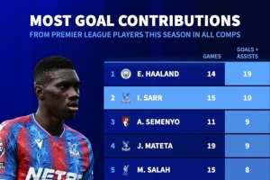 本賽季英超球員參與進(jìn)球排名(所有賽事)