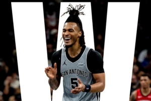 比賽結(jié)束后,馬刺官推曬出了本場(chǎng)比賽的贏球海報(bào),卡斯?fàn)柕巧戏饷妗?/p>