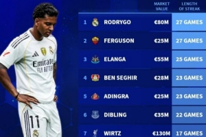 體育資訊11月8日訊 德轉(zhuǎn)盤點了目前遭遇進球荒的攻擊手,其中羅德里戈27連續(xù)27場進球荒居首,以下為具體情況(只統(tǒng)計身價2500萬歐以上球員):