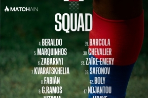體育資訊11月9日訊 北京時間明天凌晨,巴黎將在法甲第12輪比賽中客場對陣里昂,巴黎公布了此役的球員名單,阿什拉夫、登貝萊、努諾-門德斯、杜埃缺席。