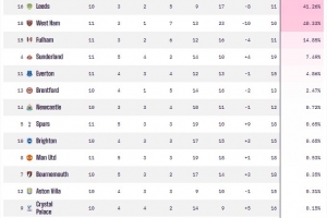 根據(jù)OPTA超級計算機的預測,狼隊的降級概率已高達90.31%,伯恩利降級概率也超過5成為50.12%,排在伯恩利身后的為諾丁漢森林(44.92%)、利茲聯(lián)(41.26%)、西漢姆聯(lián)(40.33%)以及富勒姆(14.85%)。值得一提的是,身為升班馬的桑德蘭表現(xiàn)驚艷,目前他們在英超中高居第4位,降級概率僅為7.49%。