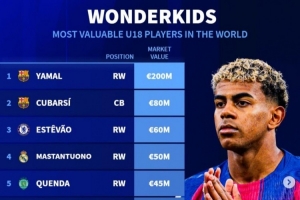 體育資訊11月10日訊 《轉(zhuǎn)會市場》統(tǒng)計了當(dāng)前世界足壇U18球員身價情況,亞馬爾無懸念2億歐獨自領(lǐng)跑。