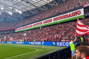 有西班牙記者曬出本場比賽畢爾巴鄂的球迷看臺(tái),可以見到許多支持巴勒斯坦的助威旗幟和橫幅。