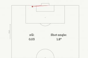 迪亞斯底線極限救球后,絲滑過(guò)人,小角度勁射死角。這里進(jìn)球的預(yù)期進(jìn)球(xG)僅0.03,射門角度1.8°。