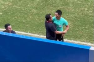 現(xiàn)場實拍視頻顯示,馬寧準(zhǔn)備向云南隊替補(bǔ)席的人員出示黃牌,隨后見到被出示黃牌的人員繼續(xù)抗議裁判,迅速跑到場邊。云南隊主教練立即試圖拉住馬寧,但馬寧最終還是出示紅牌將云南替補(bǔ)席上的工作人員紅牌罰下。