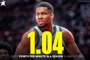 此役過(guò)后,雄鹿當(dāng)家球星揚(yáng)尼斯·阿德托昆博本賽季場(chǎng)均得分上漲至33.8分,場(chǎng)均出場(chǎng)時(shí)間為32.3分鐘,他上場(chǎng)每分鐘能得到1.04分,追平了NBA歷史記錄!