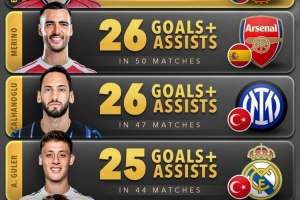 體育資訊11月10日訊 Score90統(tǒng)計了2025年五大聯(lián)賽中場球員在俱樂部+國家隊比賽中參與進球的數(shù)量,并列出榜單。