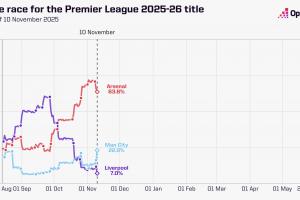 Opta曬英超本賽季截至目前的爭冠概率走勢:利物浦從賽季初被看好跌到目前的7%,阿森納目前63.6%,曼城目前22.9%