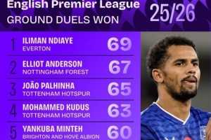 體育資訊11月11日訊 英超聯(lián)賽已經(jīng)進(jìn)行了11輪,squakwa也統(tǒng)計(jì)了本賽季英超地面成功對(duì)抗次數(shù),埃弗頓前鋒恩迪亞耶居首。
