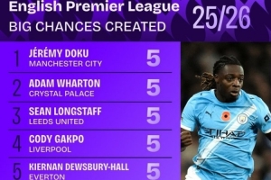 本賽季英超創(chuàng)造重大機(jī)會(huì)榜: