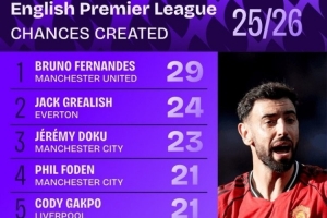 本賽季英超創(chuàng)造機會榜: