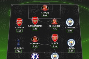 中場(chǎng):庫杜斯(熱刺)、扎卡(桑德蘭)、賴斯(阿森納)、多庫(曼城)