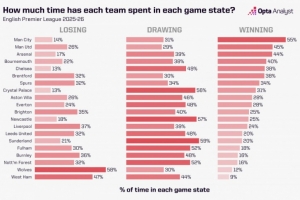 體育資訊11月12日訊 本賽季英超已經(jīng)結(jié)束了11輪的爭奪,OPTA統(tǒng)計(jì)了各隊(duì)處在領(lǐng)先、落后以及均勢時(shí)間占比情況,其中曼城平均每場比賽領(lǐng)先時(shí)間最長,達(dá)到總比賽時(shí)間的55%,而水晶宮和切爾西平均每場處在落后情況下的比賽時(shí)間最短,僅為總比賽時(shí)間的13%。