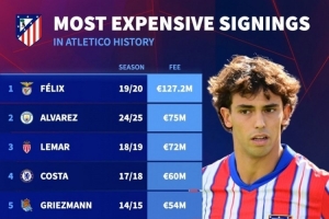 體育資訊11月12日訊 阿波羅體育資本斥資13億歐元收購馬競俱樂部55%股份,并承諾未來幾年再投資約13億歐元,德國轉(zhuǎn)會市場統(tǒng)計了馬競隊(duì)史引援的費(fèi)用,并列出最貴引援排名。