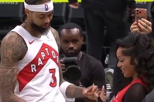 賽后,英格拉姆在場(chǎng)邊和歌手女友格洛麗亞在場(chǎng)邊秀恩愛(ài)。