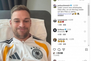 基米希社媒曬出自己在醫(yī)療室的照片,并寫道:“遺憾的是這里暫時成為了我的工作場所,我會竭盡全力,爭取在下周一(對陣斯洛伐克)重返賽場。”