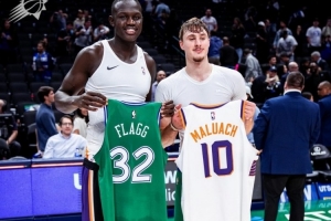 賽后,獨(dú)行俠狀元秀弗拉格和太陽(yáng)首輪10號(hào)秀馬盧阿奇交換球衣。