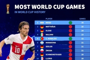 體育資訊11月15日訊 克羅地亞獲得世界杯參賽資格,莫德里奇將迎來(lái)第5屆世界杯,德國(guó)轉(zhuǎn)會(huì)市場(chǎng)統(tǒng)計(jì)了球員在世界杯的出場(chǎng)次數(shù),并列出榜單,梅西26場(chǎng)居首,C羅22場(chǎng)、莫德里奇19場(chǎng)。