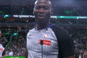 體育資訊11月15日訊 NBA杯小組賽,雄鹿VS黃蜂加時(shí)還剩1分23秒時(shí),球出界,裁判在技術(shù)臺(tái)是這么說(shuō)的: