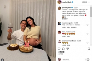 迪巴拉社媒曬出與懷孕妻子一起慶祝的合照,配文:“感謝大家的生日祝福,最棒的禮物即將到來,我已迫不及待!愛你們所有人。”