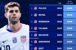 體育資訊11月16日訊 德國轉(zhuǎn)會市場盤點(diǎn)了美國球員歷史身價(jià)排名,2019年的普利西奇以6000萬歐元排名第一。