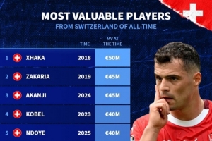 體育資訊11月16日訊 日前,德國轉(zhuǎn)會市場統(tǒng)計了瑞士球員歷史最高身價排行,扎卡5000萬歐居首。