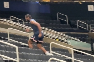 記者Noa Dalzell在賽前兩個(gè)多小時(shí)拍到了在球館內(nèi)跑臺(tái)階訓(xùn)練熱身的萊昂納德。