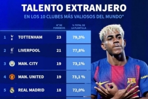 體育資訊9月18日訊 德國(guó)轉(zhuǎn)會(huì)市場(chǎng)統(tǒng)計(jì)了身價(jià)排名前十俱樂部的外籍球員占比,并列出榜單,在身價(jià)前十俱樂部之中,熱刺外援占比79.3%最高,巴薩43.5%最低。