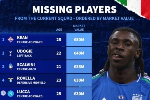缺席本期意大利隊(duì)球員身價(jià)榜: