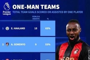 體育資訊11月18日訊 德國轉(zhuǎn)會市場統(tǒng)計(jì)了球員本賽季英超參與進(jìn)球數(shù)量占據(jù)球隊(duì)總進(jìn)球的比例,并列出榜單,哈蘭德占比65%最高,塞梅尼奧占比53%第二。