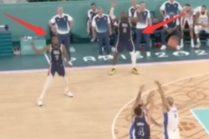 談到巴黎奧運(yùn)會(huì)決賽“金色匕首”驚世一投,庫里笑道:“我到現(xiàn)在想到那張照片就想笑,你(指詹姆斯)和KD在那兒高舉著雙手(要球)。”