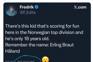 2018年9月23日,記者Fredrik在社交媒體上寫(xiě)道:“挪威頂級(jí)聯(lián)賽有一個(gè)少年,進(jìn)球如同探囊取物,而他只有18歲。請(qǐng)記住這個(gè)名字——埃爾林·布賴于特-哈蘭德。”