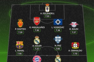 體育資訊11月19日訊 WhoScored根據(jù)球員的場均評分,列出了本賽季至今五大聯(lián)賽最佳陣容,姆巴佩、凱恩、亞馬爾在列。