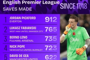體育資訊11月19日訊 Squawka統(tǒng)計17-18賽季至今英超門將撲救次數(shù),皮克福德912次居首,法比安斯基第二。