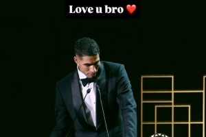 他的好友姆巴佩也通過社媒曬出阿什拉夫的獲獎?wù)眨⑴湮模骸皭勰悖值埽》侵拗酢8傻闷粒业男值?..這份榮譽(yù)實(shí)至名歸。”