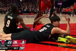 GIF-楊瀚森跟對手搶球!右手示意裁判快吹快吹!