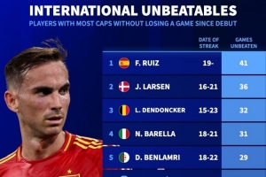 體育資訊11月20日訊 德國轉(zhuǎn)會市場統(tǒng)計了本世紀(jì)球員在國家隊的連續(xù)不敗場次數(shù)據(jù),并列出榜單,法比安·魯伊斯連續(xù)41場不敗居首。