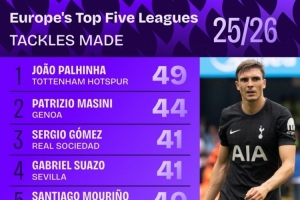 體育資訊11月21日訊 Squawka統(tǒng)計了本賽季球員在五大聯(lián)賽成功搶斷的次數(shù),并列出榜單,帕利尼亞49次居首。